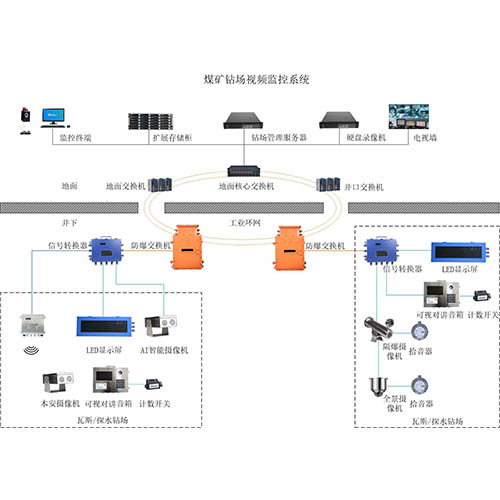 我國大部分煤礦采用傳統的瓦斯抽采鉆孔驗收方法即“三人連鎖”驗收、現場抽查驗收和探桿驗收,由于人工操作,難免會出現鉆孔驗收數據不準確等問題,不僅人工投入大,信息反饋不準確,而且打鉆的工程量容易出現偏差。為了從根本上解決這一問題,為了達到“每孔必驗”,保障鉆孔驗收數據的準確性,山東新云鵬研發了煤礦智能探放水監控管理系統,通過在鉆孔施工地點安設紅外高清防爆攝像機,借助光纜連接井下的交換機環網,之后將相關數據傳輸至地面核心交換機,最后傳輸至通風調度。