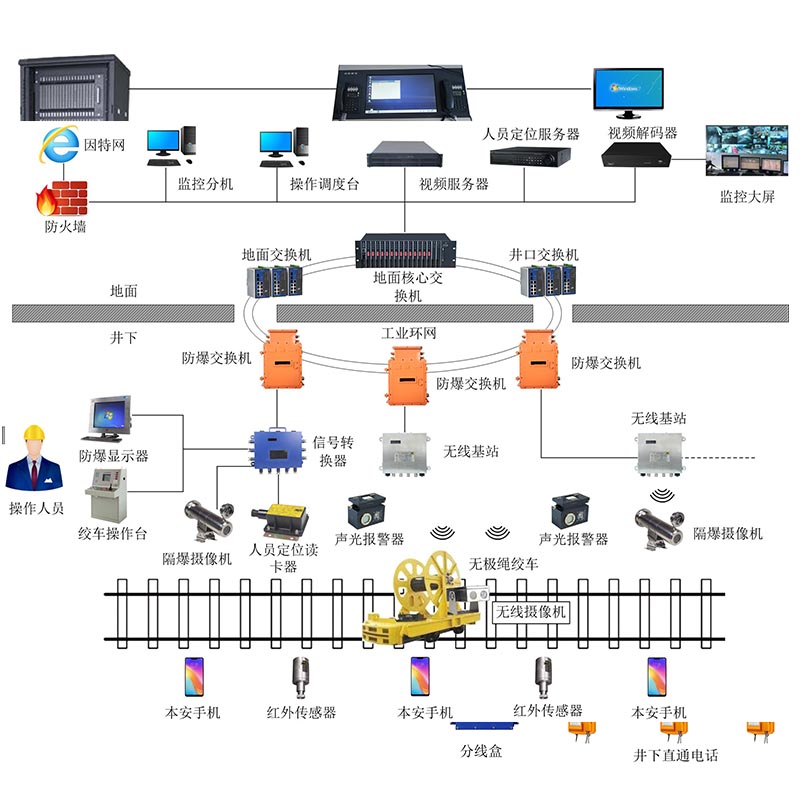 4.上傳聯網管理功能:標準的網絡協議能夠方便的接入環網或單獨組網傳輸至地面監控中心,實現地面的實時監控,提供標準的視頻圖像信號,可選擇一路或多路接入礦上現有的電視墻,做到全屏、畫面分割、輪巡顯示等視頻管理功能。系統采用標準的網絡協議,能夠方便的接入環網或單獨組網,將現場情況實時傳輸至地面監控中心,實現地面的實時監控。
