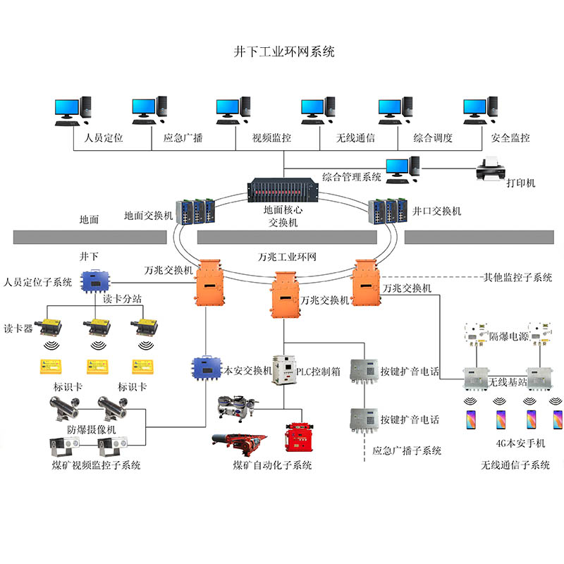 工業環網是礦井各項生產數據傳輸的核心系統,是礦山實現智能化的基礎。通過工業環網可實現井上井下數據信息的聯通。以前,大多數煤礦使用的是千兆環網,帶寬容量小,傳輸數據速度慢。這種傳統的窄帶無線通信和以太網技術已經無法滿足需求,需要進行全面升級